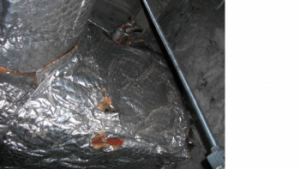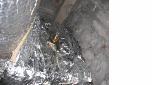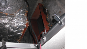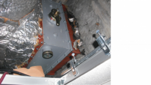 上記の写真では、保温材により判り難いですが、年代相応の特殊な形状の防火ダンパー(FD)が設置されております。